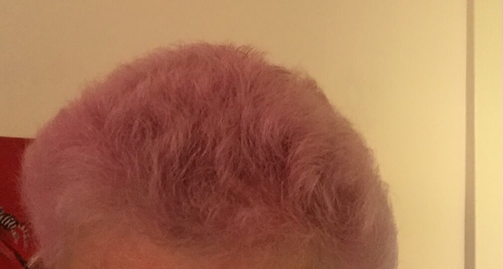 När mitt hår började växa ut efter cyto-behandlingen var det i princip vitt utom bak i nacken och lite på sidorna där det var ljusgrått. Jag hade läst om andra som också fått underligt hår efter cytostatikan. Någon kallade sitt hår för ”fårull” . Mörkgrått.
