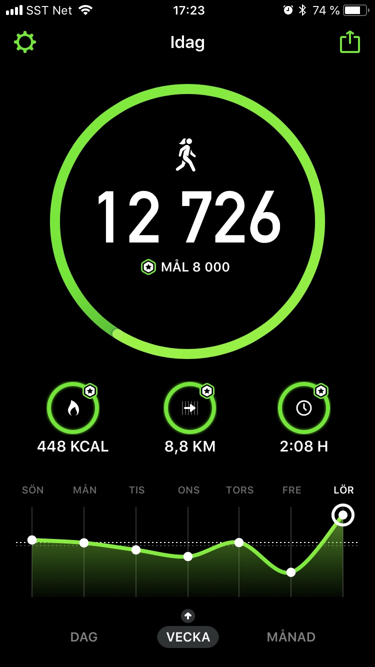 Idag blev det – inklusive stegen inne på Systembolaget – 12 726 steg. Hurra. Vad mycket!