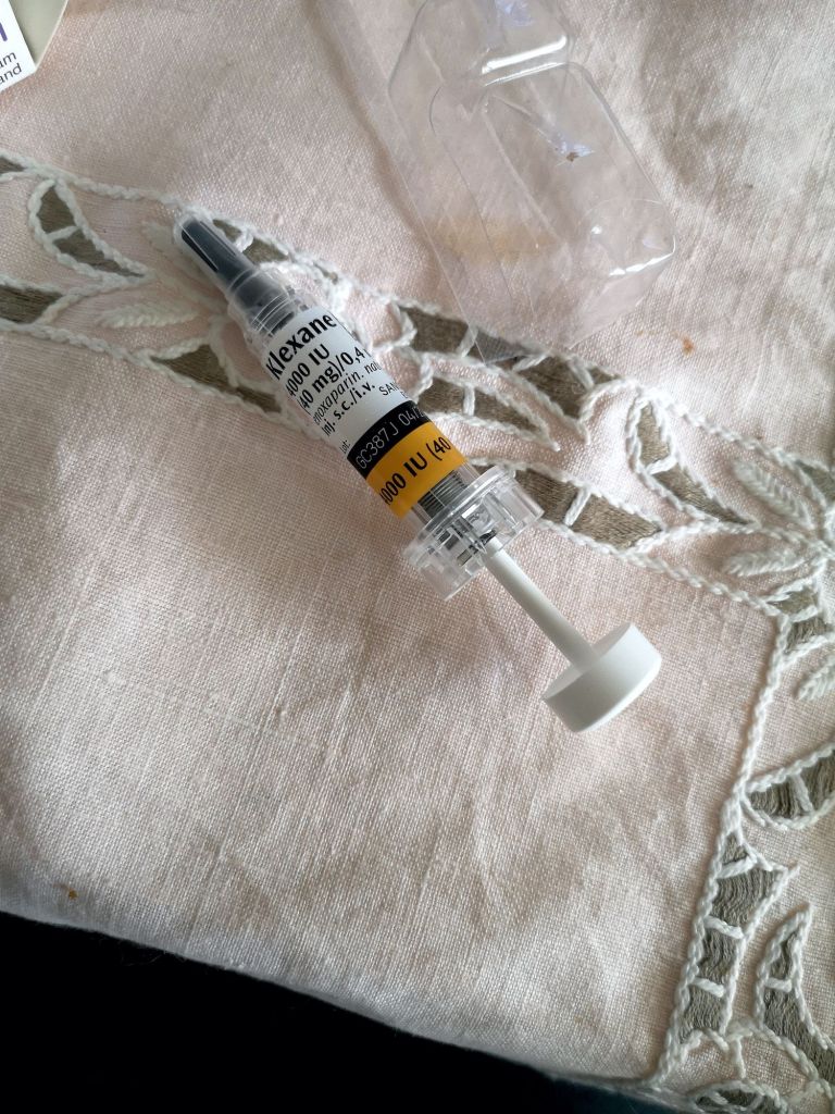 En gång om dagen sedan operationsdagen den 15 april fram till den 21 april har jag fått Klexane som ska motverka blodpropp.