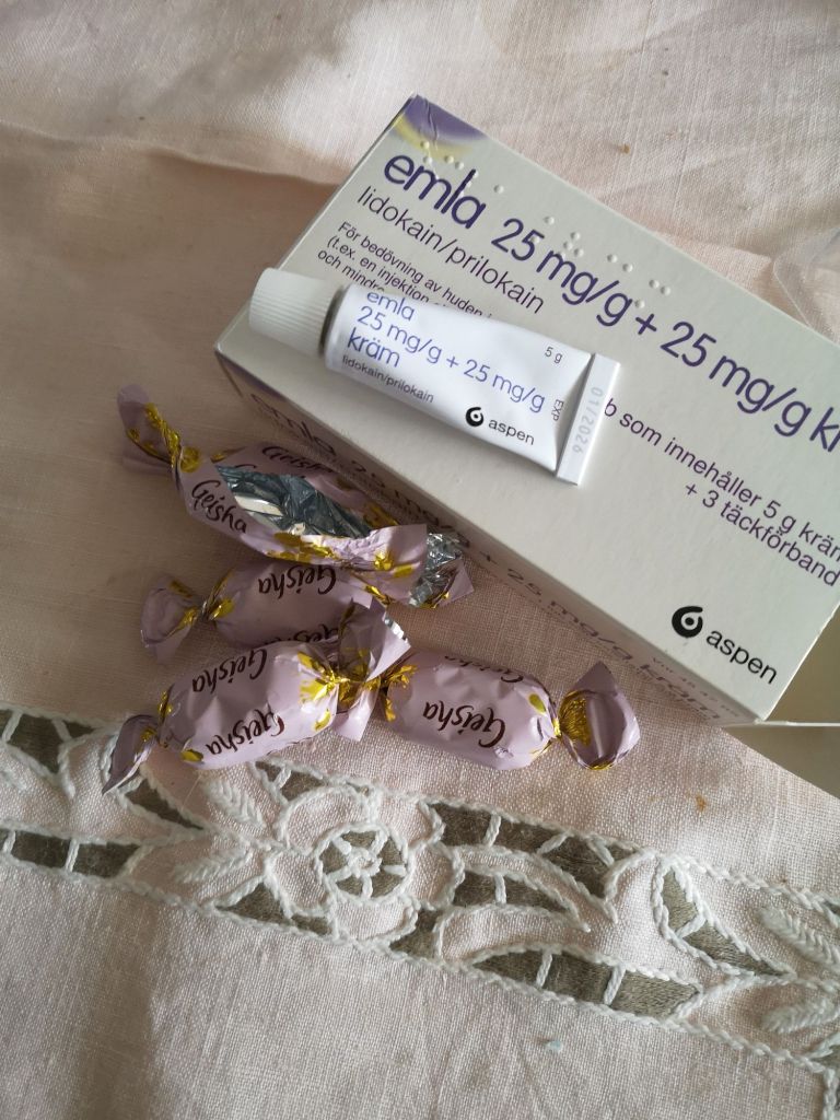 I förrgår och igår har jag haft mina rosa – vitrandiga stödstrumpor på. Dessa köpte jag när jag gick på mina cellgifter 2017. Glad jag sparat strumporna.